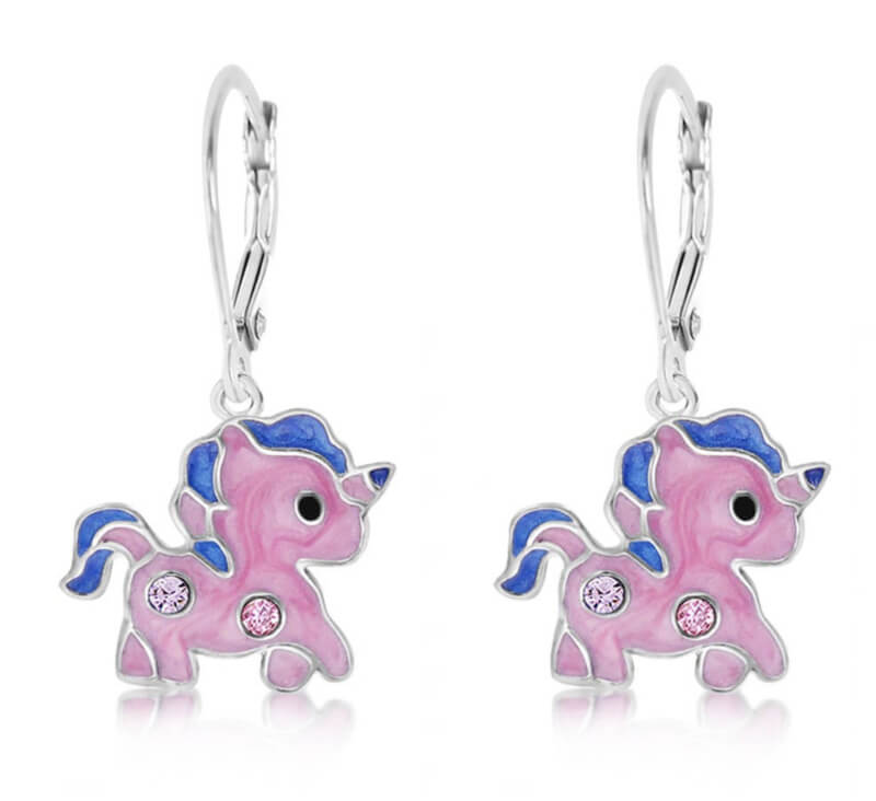 Zilveren kinderoorbellen: Eenhoorn roze (brisure sluiting)